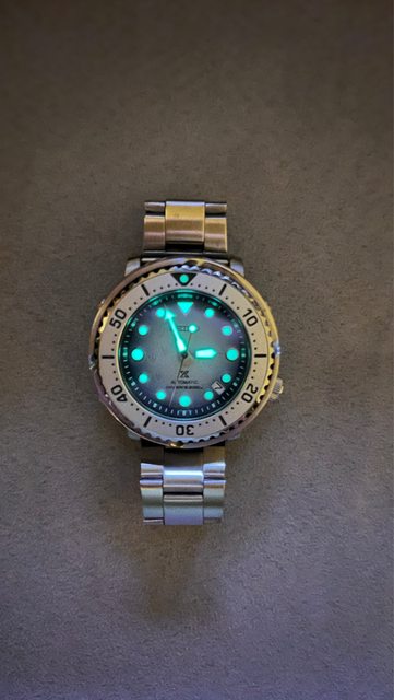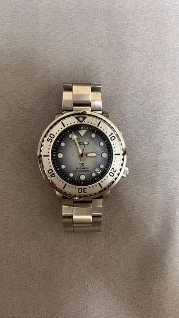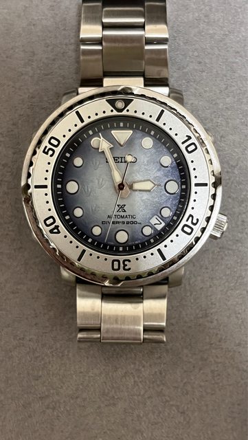 商品名稱:Seiko SRPG59 企鵝漫步(已售出) 交易縣市:嘉義市 數量:1隻 預售價格:8000 新舊狀況:2022/03/11,無碰撞、劃痕 交易方式:面交或寄送 聯絡方式:站內信 其他說明 : 錶徑43.2mm,厚度12.6mm,防水200m,盒裝完整 商品描述:整體約9成新,無碰撞,配戴後皆正常清潔保養,原錶帶錶扣有正常使用痕跡 ,贈一金屬錶帶 網站參考:https://www.seikowatches.com/tw-zh/products/prospex/srpg59 曾經有陣子很喜歡罐頭,看了許久的罐頭都沒看到喜歡的,因緣際會看到了這隻,小巧尺 寸適合配戴,還有企鵝腳印於盤面,時標飽滿的白色夜光塗層也像雪球,非常好看,調整 收藏,故幫愛錶找有緣人 https://i.imgur.com/WJAhhte.jpg