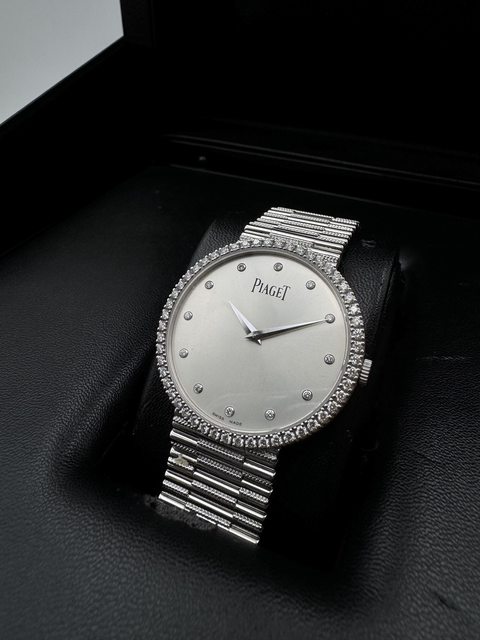 備註:Altiplano傳統腕錶,直徑34毫米。18K白金琺瑯錶殼,鑲飾52顆明亮形切割圓形美鑽