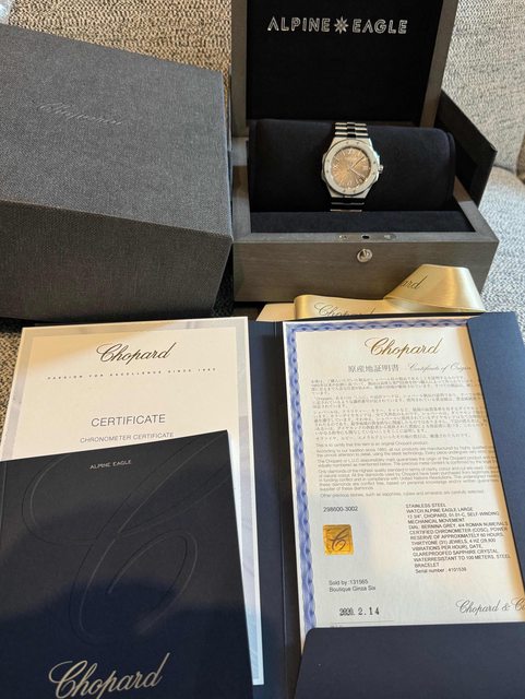 品牌: Chopard 錶款: Alpine Eagle 298600-3002 灰雄鷹 防水深度 :100M / 機芯 CHOPARD 09.01-C 動力儲存約60小時 年份: 2020/02 屬品: 盒單齊全 錶節完整無少 售價: 299,000 附註: 無刻碰大傷正常使用痕跡,走時+3~4s/day