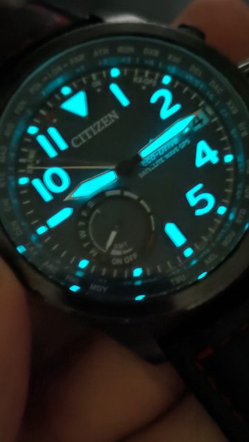 如圖!盤面顏色非全黑、也非藍綠色,是一種特殊的霧面藍灰,PROMASTER的夜光明亮(
