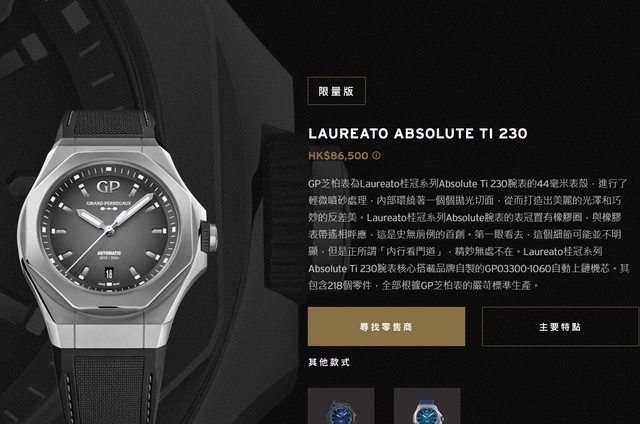 寶珀已售出,感謝各位幫推 持續調整價格,限時降個一兩週試看看 品牌名稱:GP 手錶型號:LAUREATO ABSOLUTE TI 230 購買年份:2021/11 欲售金額:160000 所在地:台中市 隨附物件:盒單皆齊 聯絡方式:站內信+LINE聯繫 交易方式:台中市市區約面交 物件描述:台中寶鴻堂購買,少配戴,平常皆放置防潮箱內保存 官網已刪除連結,可參考以下相關連結、截圖