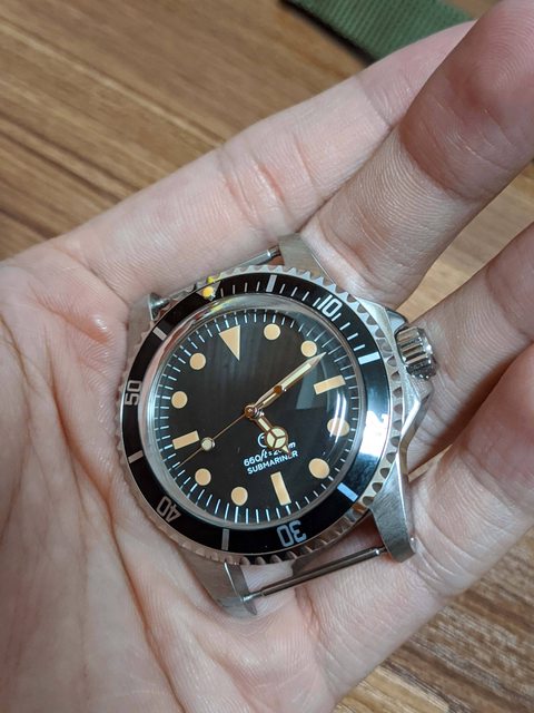 A機芯,壓克力泡泡鏡+鋁圈,錶盤和夜光珠都用較復古的黃色~實際質感很不錯,挺過癮的