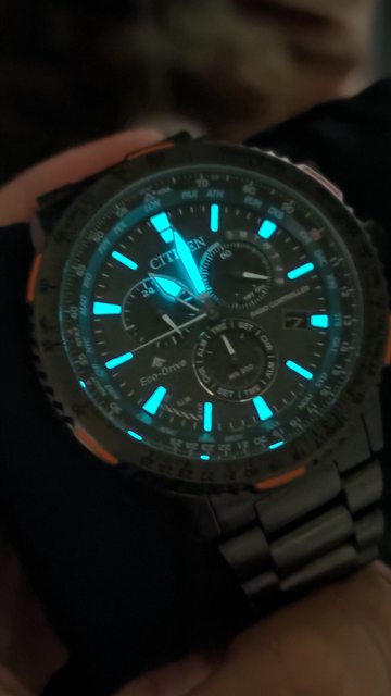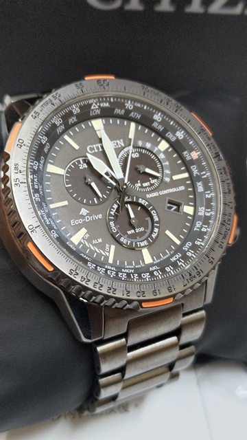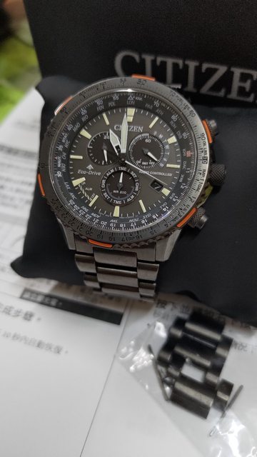 Citizen Promaster 飛行系列的顏值擔當,鐵槍灰的外圈飛行尺配上橘紅色的開孔就像戰