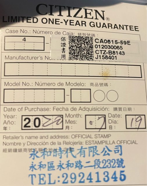 購入日期:2020/7/19 永和第一鐘錶購入(過保)