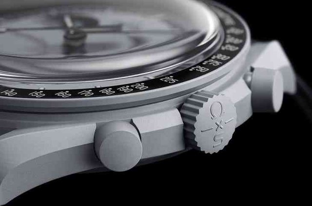 ▲手錶以灰色生物陶瓷製作,錶冠上同樣刻有歐米茄 x SWATCH雙品牌Logo。