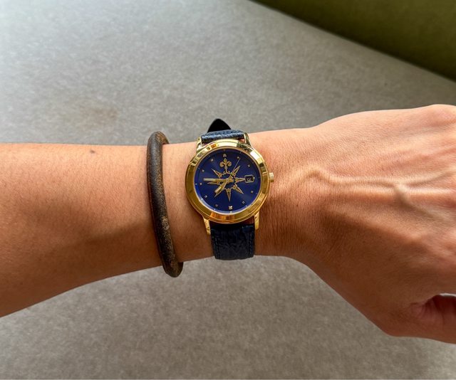 這樣面盤設計以指南針造型為設計,12點鐘是皇冠上的百合花飾logo,藍金面的搭配整體