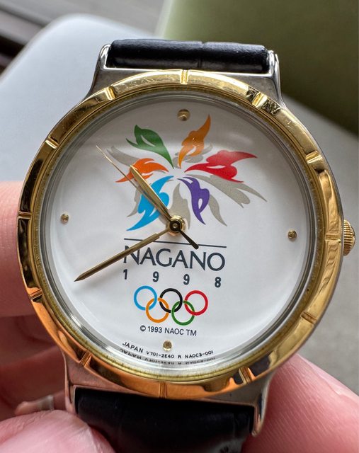 2. Seiko 1998年日本長野奧運紀念石英錶,還蠻喜歡中間Logo的配色,金色外圈,不鏽 鋼錶殼,走時正常,售2500含運~